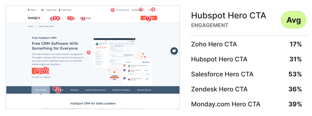 The ‘Get Free CRM’ CTA proved effective, with 31% of visitors clicking there first.
