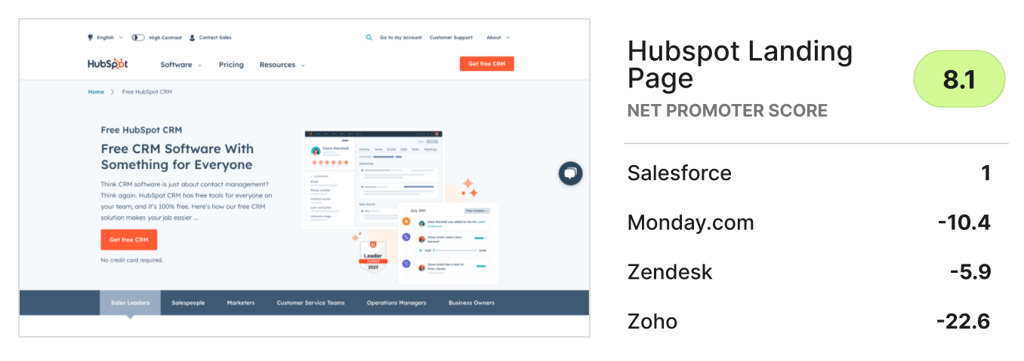 Hubspot’s landing page proved to be one of the strongest among competitors, encouraging high engagement with their ‘free’ CTAs and producing the strongest net promoter score of the five CRM platforms.
