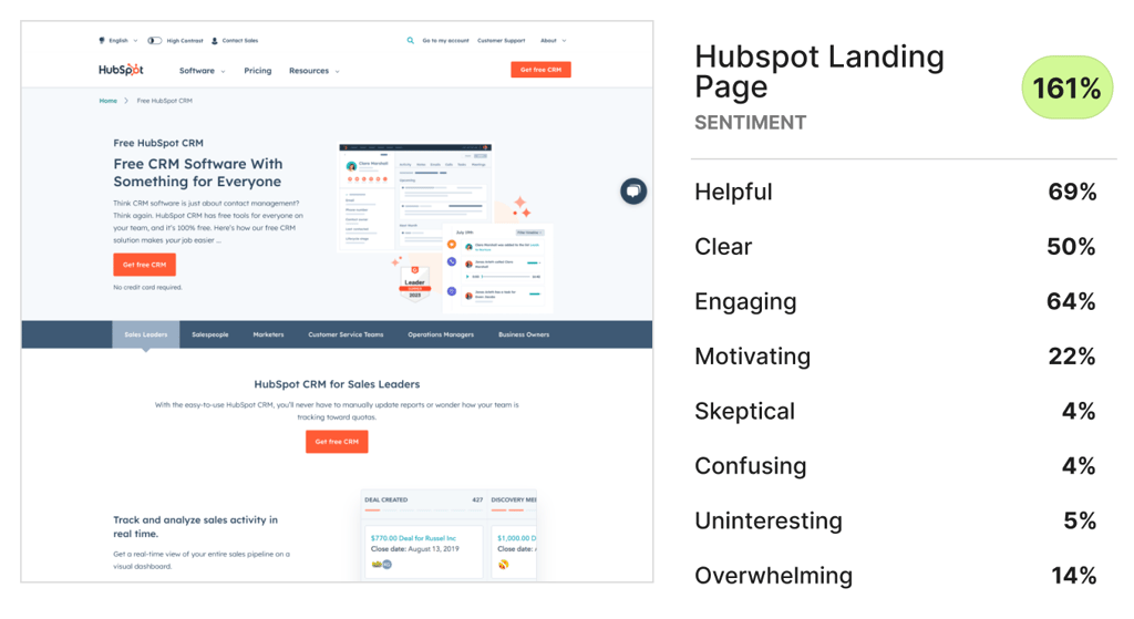 - Hubspot’s landing page produced the most positive impressions out of the 5 competitors tested, tied with Zendesk at 160 Net Positive Alignment (the sum of positive impressions shared by visitors minus the sum of the negative).