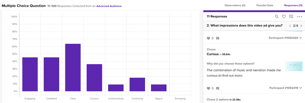 This combination of quant and qual data will show you how participants react to your video ads, and most importantly, why.