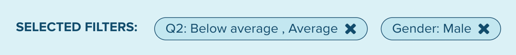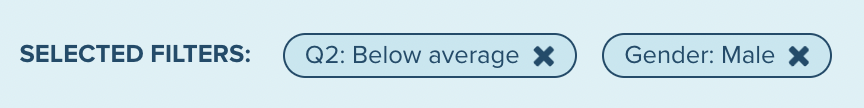 When you add filters to the survey, the filter pill will show next to Selected Filters in the Audience Bar. Each pill will show where the filter was activated on the survey and the filter option that was selected. A filter activated on a question will show the question (Q2) and answer choice (Below average) on the pill, while a demographic filter will show the demo (Gender) and selection (Male).