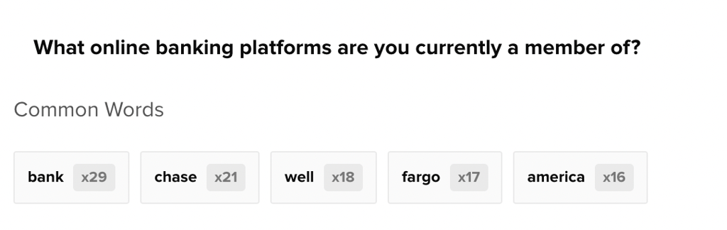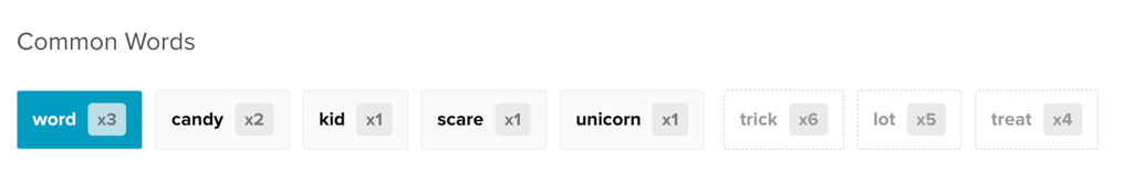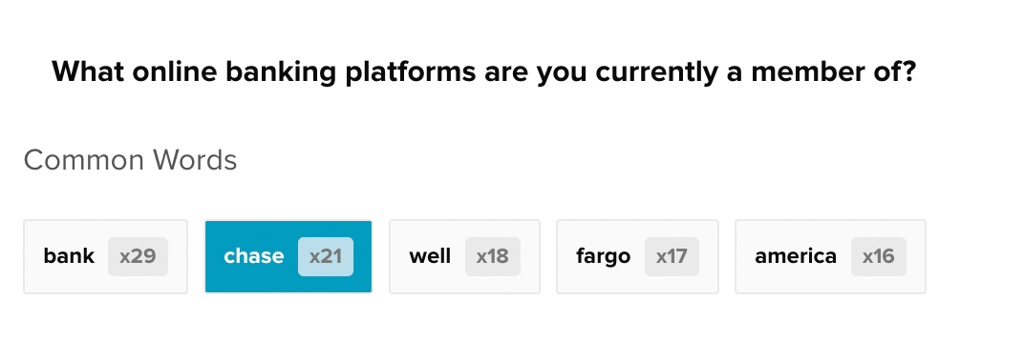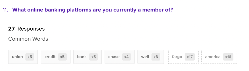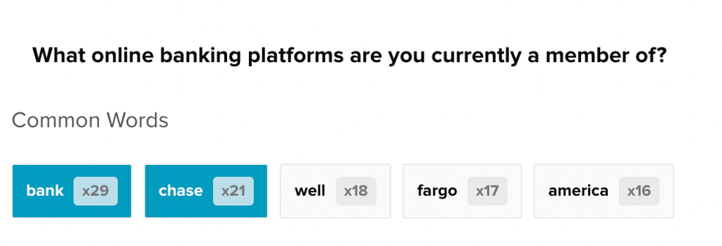 When you activate a filter on another question in the survey, the free response data will update to show the new most common words in the data set (solid boxes) and the most common words in the original unfiltered responses (gray outlined boxes).