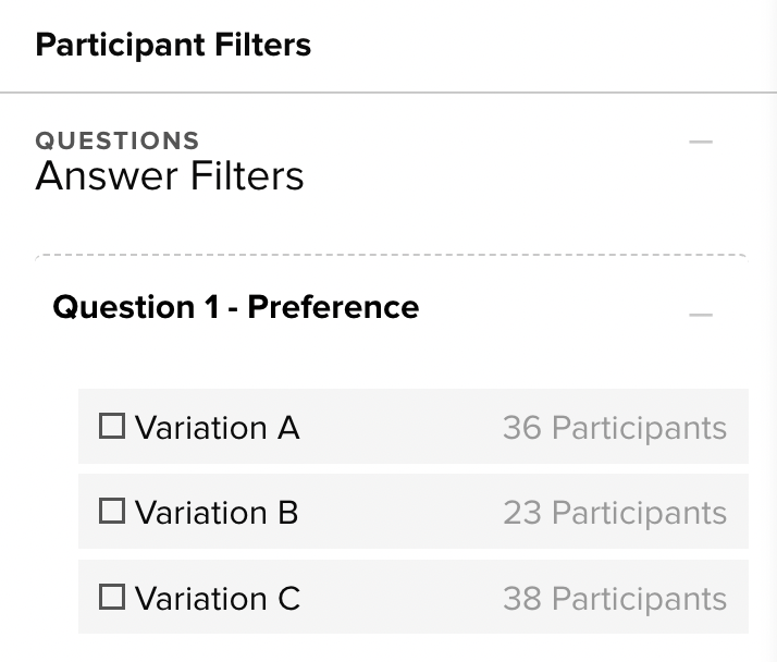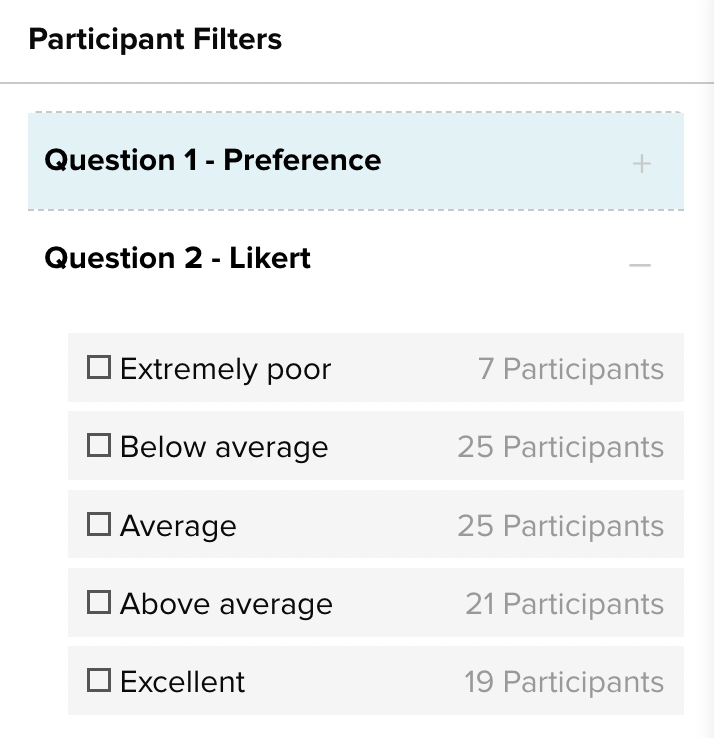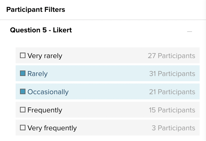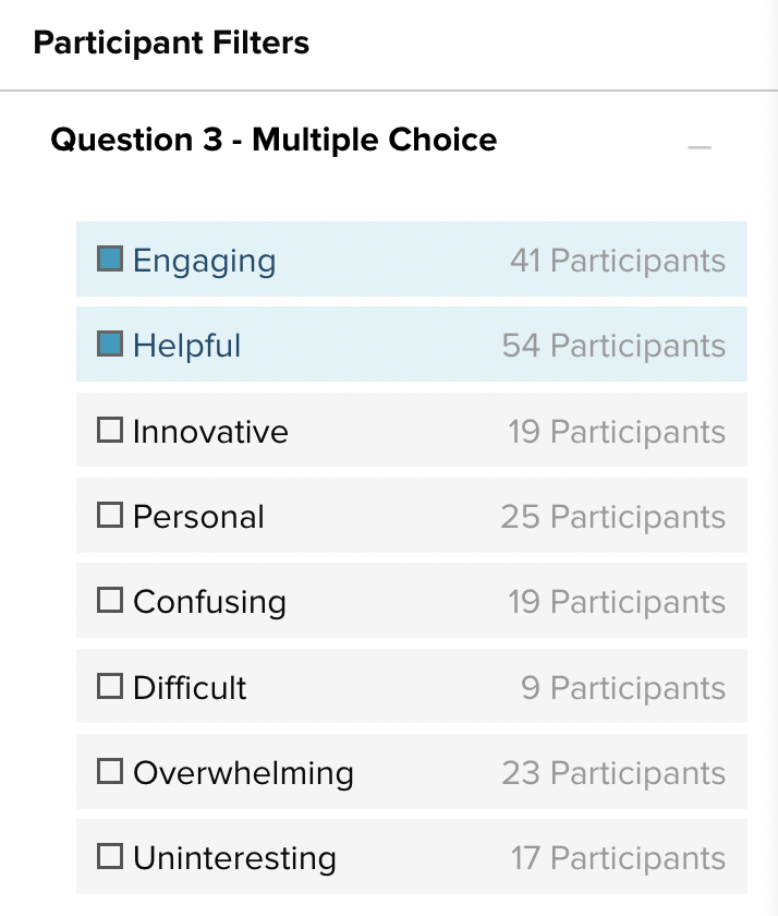 Each answer option in the Filters panel will show you the written answer itself and the number of participants who selected that answer.