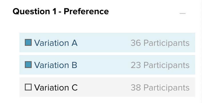 When a filter is active on another question, and you activate a filter on a Preference question at the same time, the selected variation will show the unfiltered and filtered data.