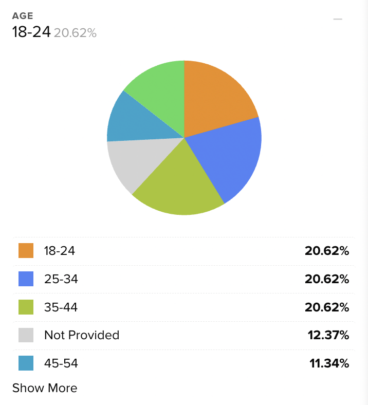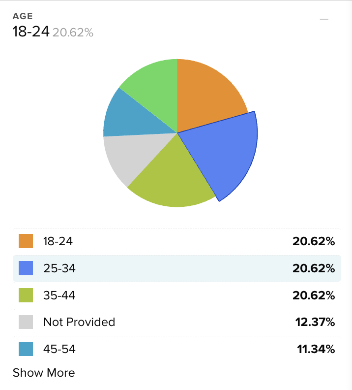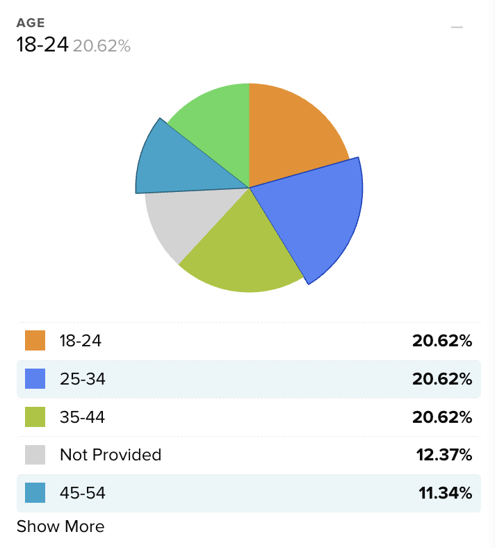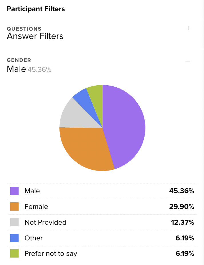When the demographic filter is activated, that section of the pie chart will enlarge and the option will be highlighted in the list below. Like the question filters and data charts, multiple filters can be selected at the same time in a single demographic, or across multiple demographics.