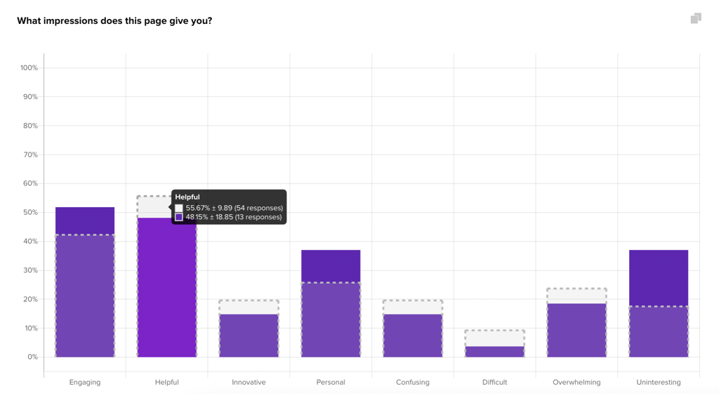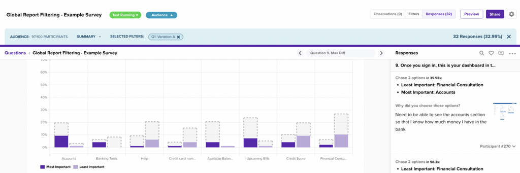 When you activate a filter on another question in the survey, your Preference question will reflect the new filtered data (dark purple bars) and the original unfiltered data (dotted outlines).