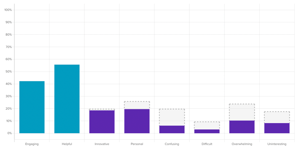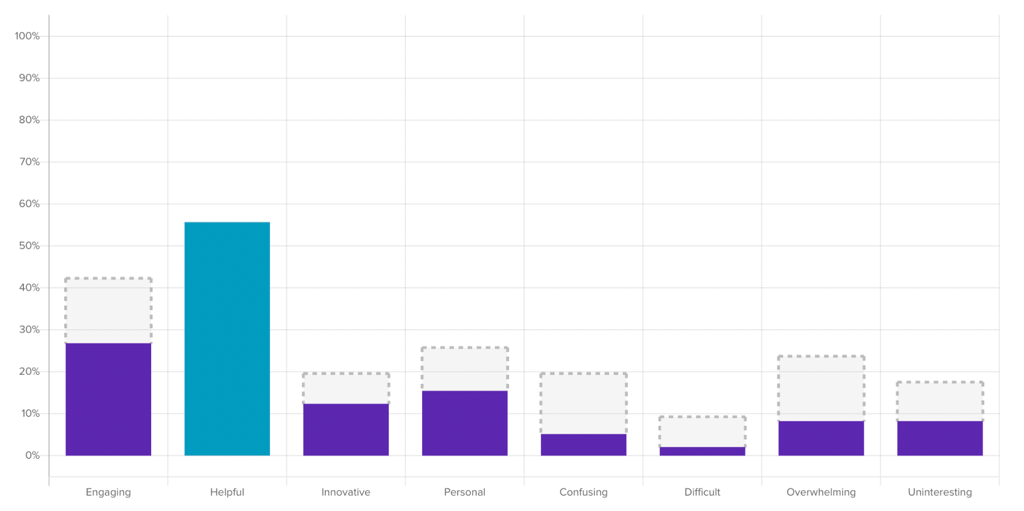When you activate a filter, other questions in the survey will reflect the new filtered and unfiltered data. The dark purple data bars represent your new filtered data set, and the gray dotted outlines represent the original unfiltered responses.
