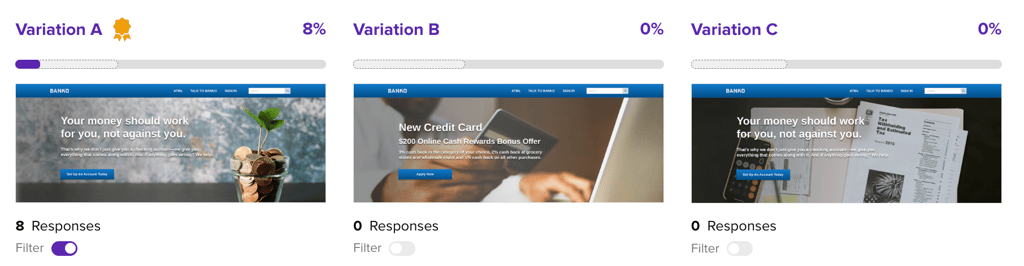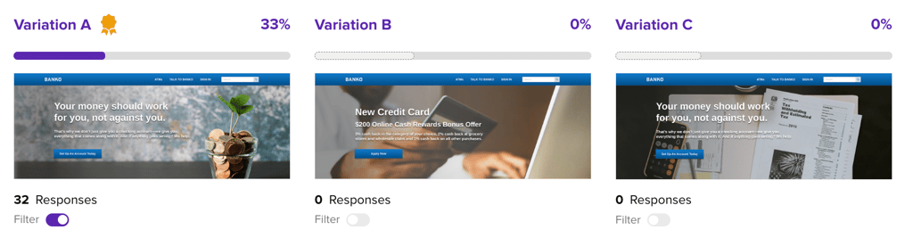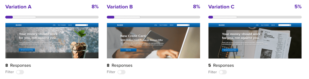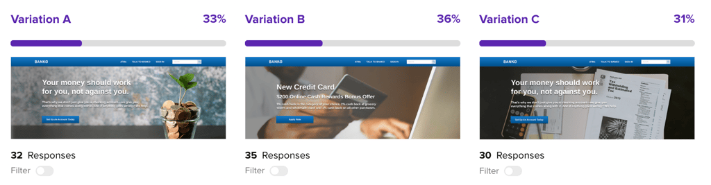 To activate a filter on a Preference Test, click the Filter toggle below the desired variation.