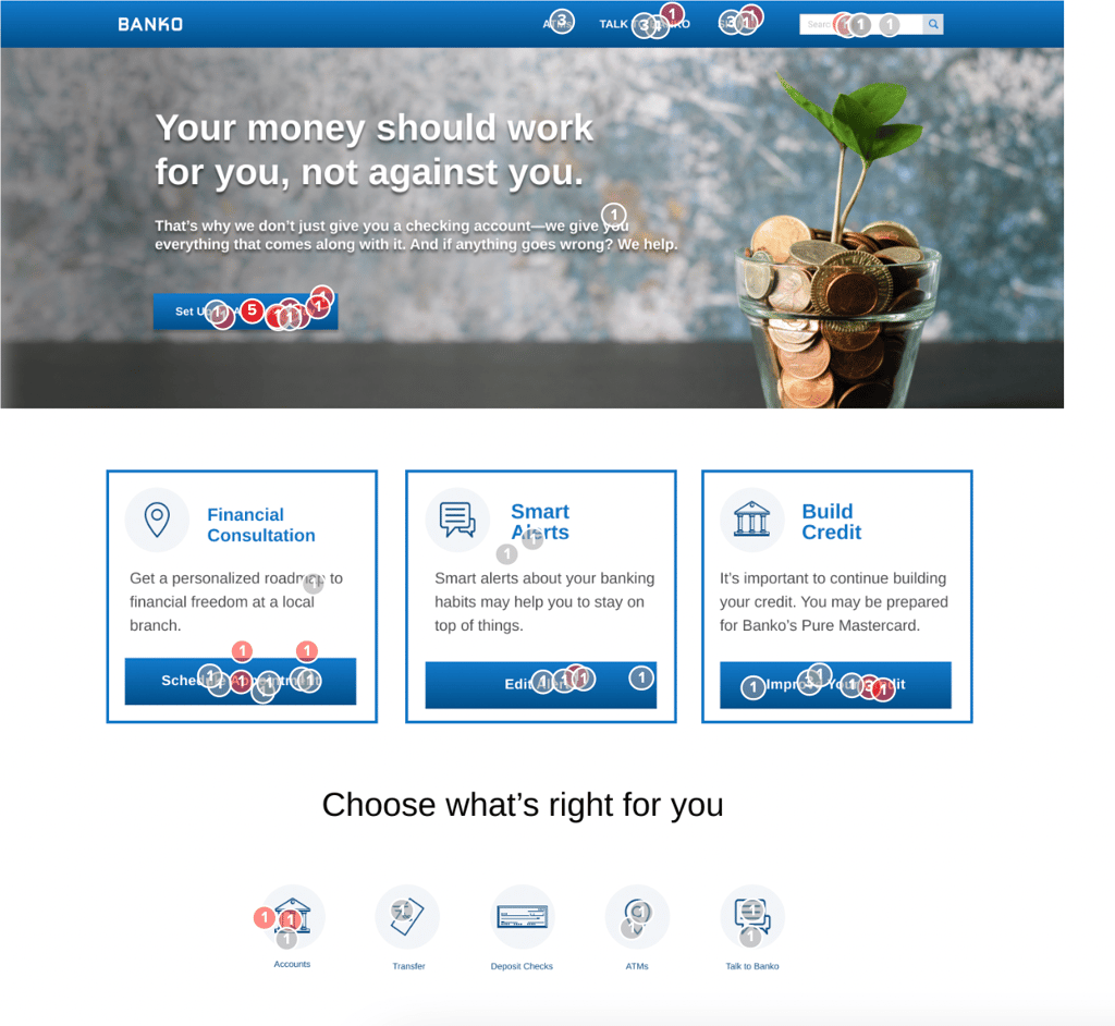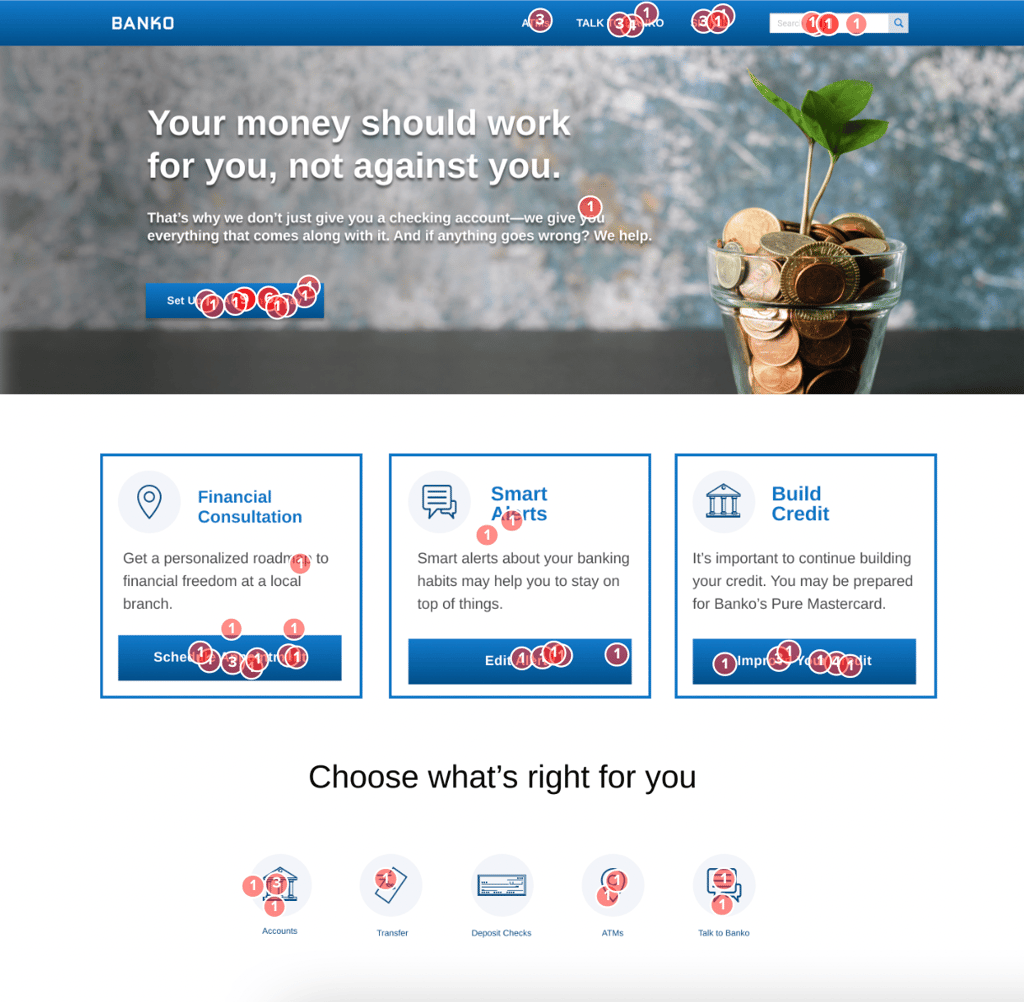 When a filter is activated on another question in the survey, the click report will reflect the filtered data (red dots) and the original unfiltered responses (grey dots).