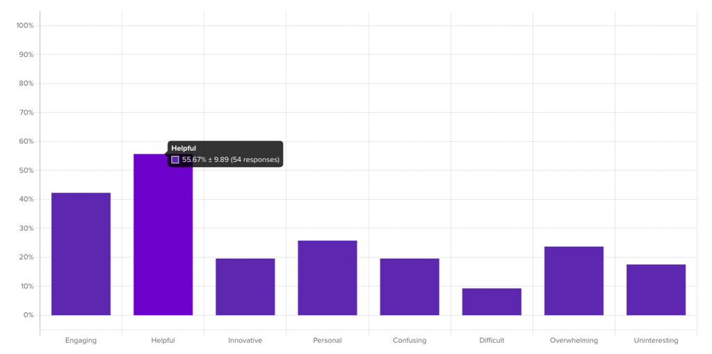 Hovering over a bar in a bar chat will show you the percentage of participants who have selected that answer, and clicking on the bar itself will activate the filter so that only responses from participants in that answer pool are shown on the survey.
