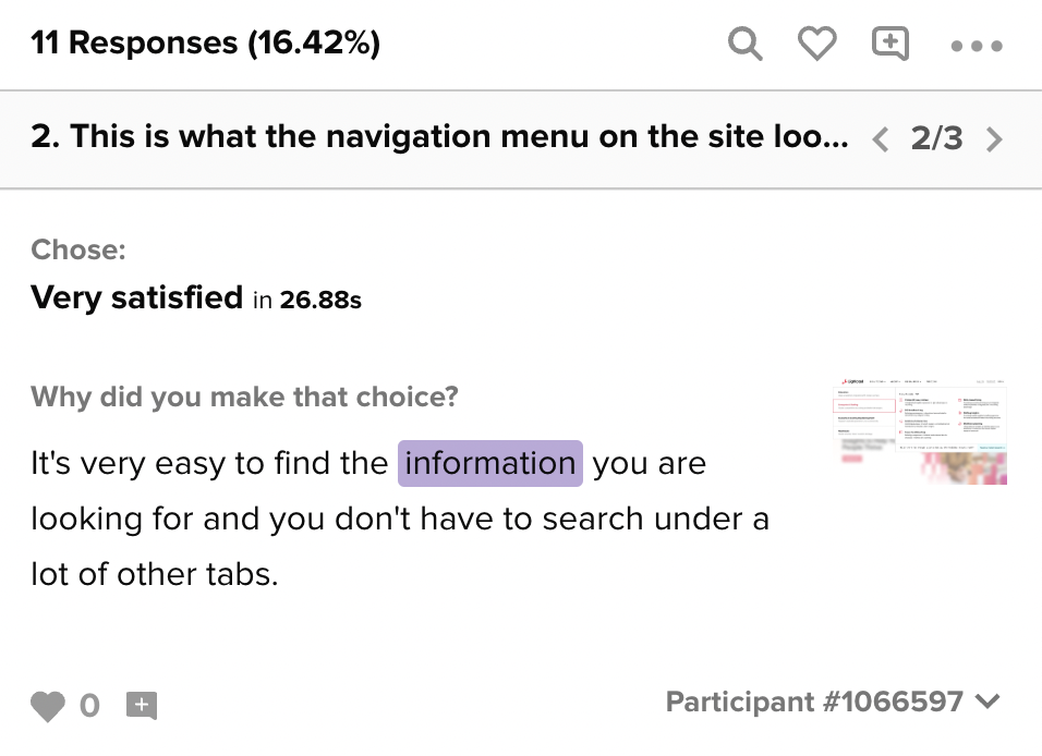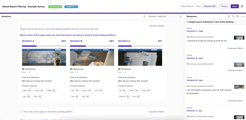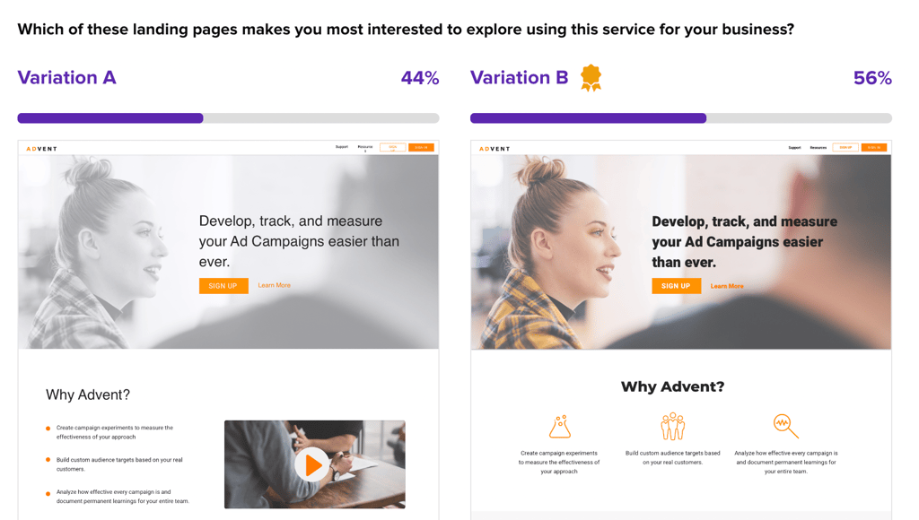 A preference test allows you to click into one of the variations to filter responses by those selected clicked A or B (or C).