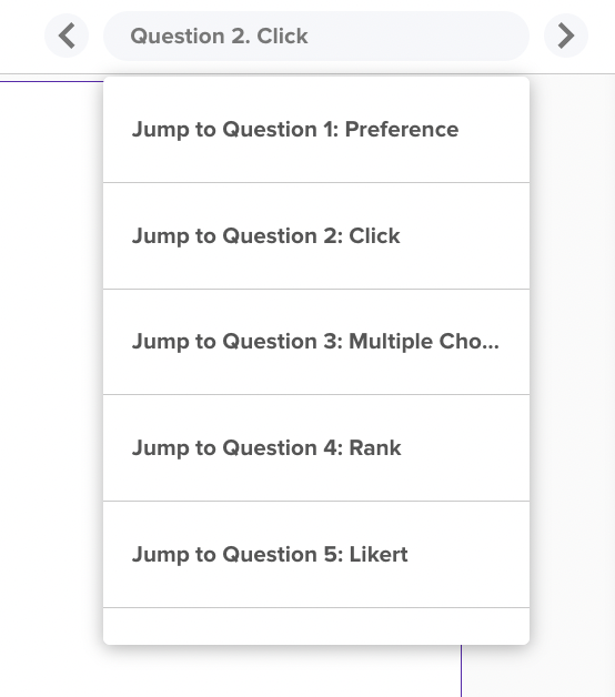 You can quickly jump-to any question in the survey using the dropdown menu in the top-right of the questions column, and arrow through questions individually.