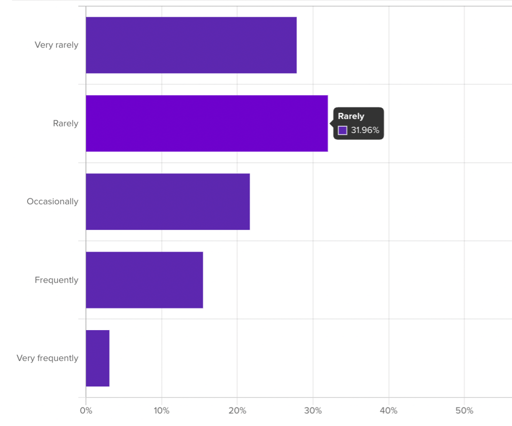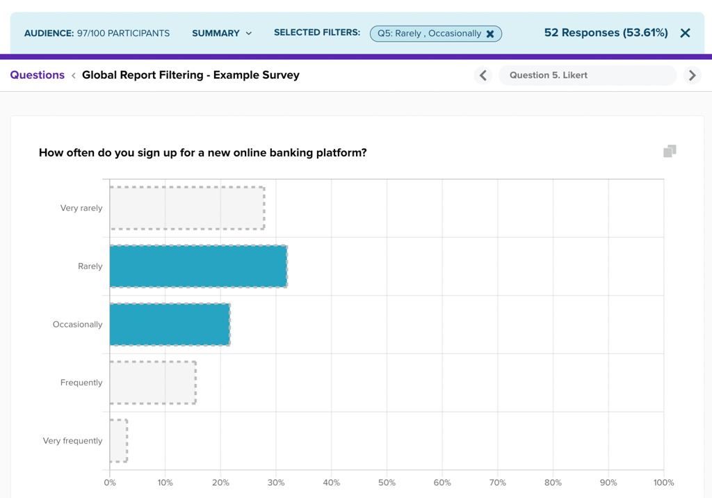 Click on a data bar to filter the report so you only see responses from participants who selected that answer. You can select as many data bars as you want to activate multiple filters, and to see the total percentage of a collection of answers.