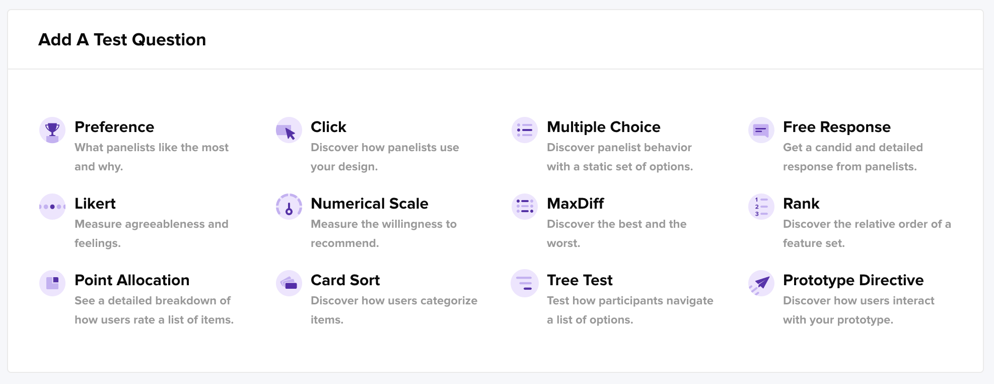 Choose from up to 12 different question types in Helio. The current question limit for Pro level accounts is 10 per survey, while Enterprise accounts have access for up to 20. Use follow-up questions to extend your question count and gather key qualitative information!