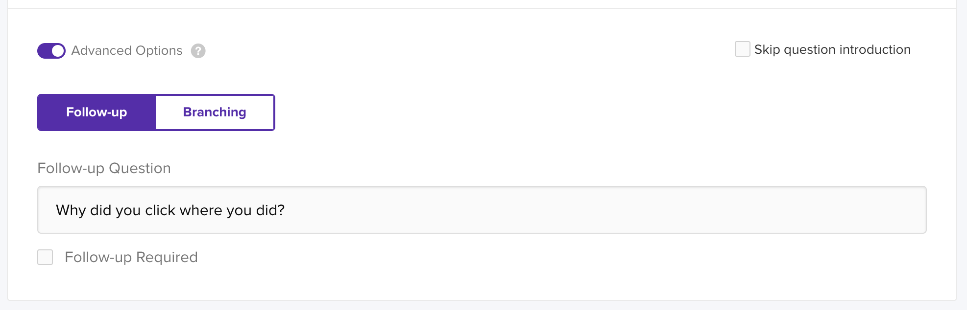 On most question types in Helio (excluding free response), you can use follow-ups to gather written feedback from participants to help explain their quantitative reactions. Select the Advanced Options toggle at the bottom of the question card, and choose whether you would like your follow-up question required or not.