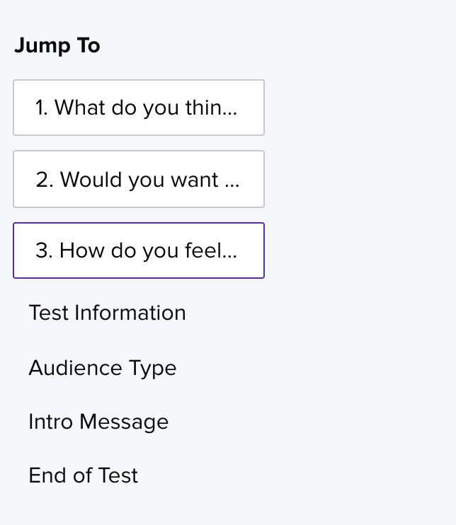 One of the key features of the test creation page is always available in the Jump To menu to the left. Use this sidebar menu to auto scroll to different parts of your survey. This is also where you can rearrange the questions in your survey by clicking and dragging the question cards into place within the jump to menu.
