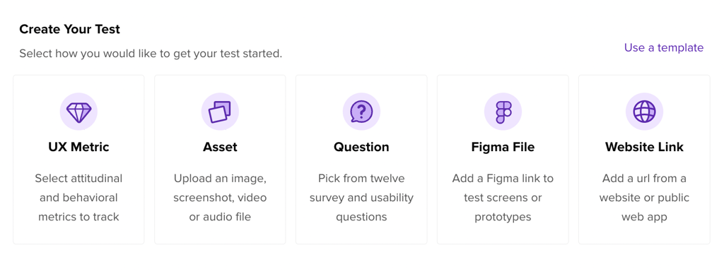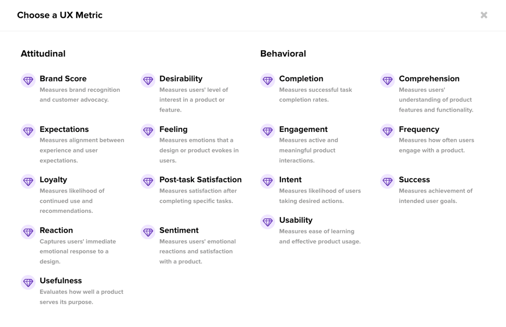 After selecting a UX Metric to create your test, you will see the current selection of 16 metrics. Choose a single metric to measure a single aspect of your design, or combine multiple metrics in one test to assess everything from user interactions to consumer sentiment towards your product: