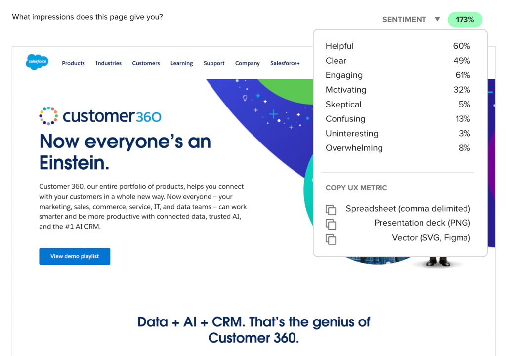 For instance, consumer reactions of this landing page resulted in a Sentiment score of 173%, indicating High positive impressions for the design:
