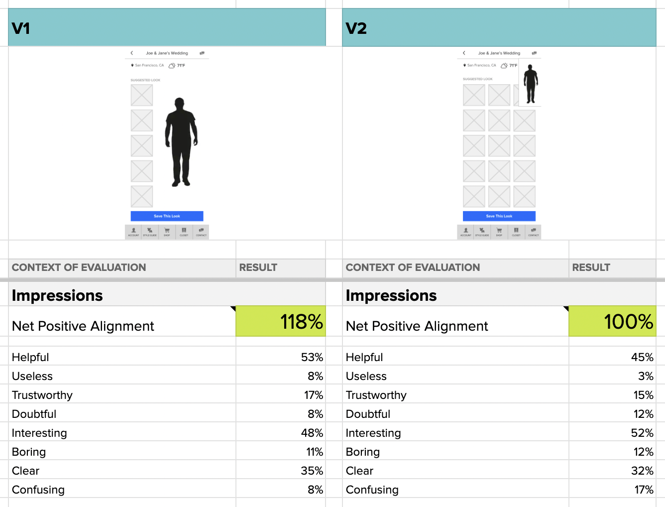 This is a data spreadsheet rollup using Helio to capture an emotion response to two variations in a multivariate test.