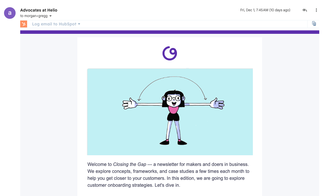 This is an example of the Helio newsletter, Close the Customer Gap.