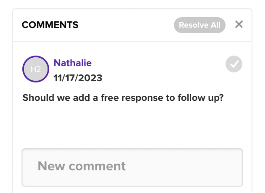Once a question has been reviewed and updated, check it off to remove the comment from the survey.